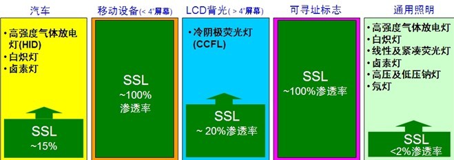 如今,在屏幕尺寸小于4英寸的手机、相机闪光等移动设备应用中,及路边及体育场中大型显示屏应用中,LED照明,或称固态照明(SSL),几乎占据了100%的份额。除此之外,LED照明也向其它领域迈进。如在汽车应用中,LED照明占据约15%的份额。而在较大液晶显示屏(LCD)背光应用中,虽然冷阴极荧光灯(CCFL)如今仍然占据主导地位,但LED照明的总渗透率也达到约20%,参见图1。特别是在备受瞩目的大尺寸液晶电视背光应用中,据Laurent Jenck指出,预计LED背光的液晶电视在未来3到4年间,将占据至50%的份额。