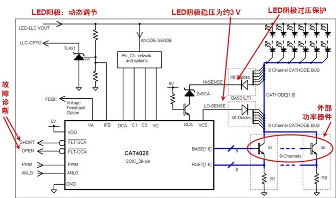 其它应用,如建筑物照明中,同样可以采用安森美半导体的高能效LED驱动方案,如CAT4103、CAT4109三通道线性恒流驱动器是高亮度RGB LED驱动器,应用于新兴的高亮度、高视觉冲击力LED建筑物照明中的RGB LED像素控制。而CAT4106是多通道升压型LED驱动器,适合较大尺寸的通用LCD背光应用,能够驱动多达40个白光LED,提供总计达6 W的LED输出功率,并帮助设计人员提升背光能效至最高。此外,采用LED背光的大尺寸液晶电视日趋多,其中尤以侧光式LED背光为主,通常需要采用6个单串的LED光条(每串LED视为一个LED道)。现有6通道侧光式LED电视中每个LED通道均含有专用驱动器IC、电感型DC-DC升压转换器及及开关。而安森美半导体应用于大尺寸侧光式LED背光液晶电视的多通道线性LED驱动器CAT4026是一种高性价比方案,支持高数量的通道,能以单颗IC控制6个LED通道,能效目标范围高于90%,能效典型值量多达94%,且针对 LED开路和过多LED短路等故障条件提供保护。CAT4026的简略应用示意图参见图2。