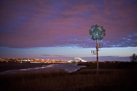 这款名为“未来花”的雕塑是由英国设计师在墨西河边建造的。它是一朵高达14米的金属花。花瓣是用穿孔镀锌钢板制成的,花朵中间装有LED灯,并配备小型风力发电机为其供电。在夜间,这朵花会发出光亮,装点着威德尼斯的夜空。不过总觉的威尼斯应该用潮汐、水等绿色能源较为方便吧……