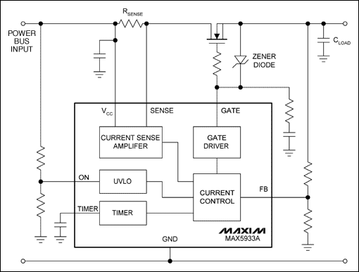 图3. MAX5933热插拔控制器保护电源总线不受浪涌电流及短路故障的影响。