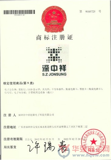 为进一步打造企业良好的品牌形象,我司于2011年开始策划商标注册事宜并向国家商标总局提出申请“深中祥”商标。经过了近一年多的受理、初审、公示等一系列法定程序,于2012年2月21日注册成功并获得商标注册证书。按照商标法规定,“深中祥”商标从2012年2月21日开始至2022年2月20日有效,核定商标使用商品为9、11类,具体包括电子公告牌、LED显示屏、半导体器件、集成电路卡、信号灯、计算机周边设备、灯泡、LED灯、路灯、日光灯管、汽车照明设备等二十多项使用项目。
