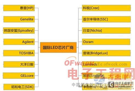 目前国际LED芯片厂商有:科锐[Cree]、首尔半导体[SSC]、日亚[Nichia]、Osram、普瑞[BridgELux]、Lumileds、旭明[Smileds]、丰田合成(株)[ToyodaGosei]、昭和电工[SDK]、GELcore、大洋日酸、TOSHIBA、Agilent、韩国安萤[Epivalley]、Genelite、HP等,其中重点厂商概况: