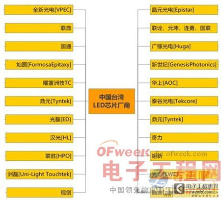 中国台湾地区LED芯片厂商包括:晶元光电[Epistar]、(联诠、元坤、连勇、国联)、广镓光电[Huga]、新世纪[GenesisPhotonics]、华上[AOC]、泰谷光电[Tekcore]、鼎元[Tyntek]、奇力、钜新、光宏[KWE]、晶发[Ubilux]、视创、洲磊[Uni-LightTouchtek]、联胜[HPO]、汉光[HL]、光磊[ED]、鼎元[Tyntek]、曜富洲技TC、灿圆[FormosaEpitaxy]、国通、联鼎、全新光电[VPEC]等。