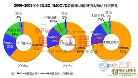 当前,我国掀起一股LED投资热,疯狂采购MOCVD机,2010年单在发改委登记备案的就有近700台,有些厂家不等发改委的补贴而直接购买。而MOCVD机台差不多被德国厂家AIXTRON和美国厂家VEECO垄断(两家MOCVD设备厂垄断了全球MOCVD设备90%以上的市场份额),两家产能有限,订单已经排到2012年。