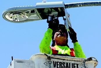 工人为一个路灯更换新的LED灯部件