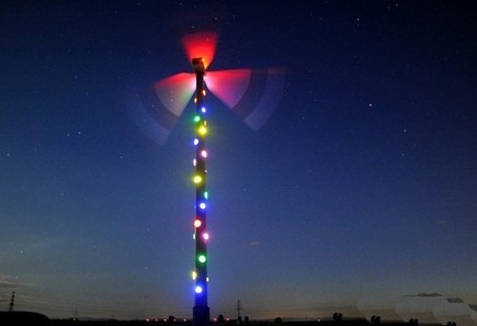 独特的led发光风车,位于德国北部城市汉诺威,由法国艺术家帕特里克.雷诺设计,在大型的风力发电机的扇叶和塔体上增加LED装饰灯,让LED彩灯发出色彩斑斓的光,随着风扇转动产生梦幻般的效果,LED电源也由风力发电机提供,当风大起来的时候,LED灯也会越来越亮,美丽闪耀在夜空中。