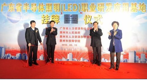 3月13日上午,广东省半导体照明LED职业研发应用基地挂牌仪式在惠州市技师学院举行,省人力资源和社会保障厅副厅长张凤岐出席。据悉,该应用基地是全国第一个LED职业研发应用基地,也是广东省首批15个职业研发研发应用基地之一。