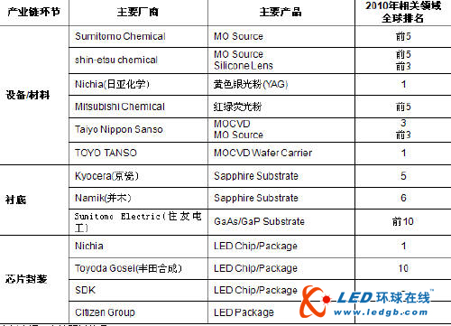 日本是目前全球第一大LED生产国,拥有从原材料与设备、衬底、外延、芯片、封装、应用的完整产业链。2010年,日本LED企业销售额占全球市场的25%以上。其中,在上游设备与原材料环节规模和技术优势明显;LED衬底环节销售额约占全球的16%,全球前10大制造商中日本企业有3家,其中京瓷是全球最大的蓝宝石衬底供应商,并木位列第二;在LED外延/芯片环节,则拥有日亚化学(全球最大的外延芯片厂商)、丰田合成等龙头企业。