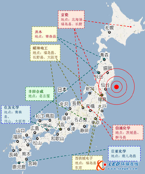 目前日本主要LED厂商分布较广。其中在地震直接影响区域内,有三家材料/设备生产商(住友化学、信越化学、三菱化学),两家蓝宝石衬底生产商(京瓷、并木),以及两家芯片封装生产厂(昭和电工、Citizen电子)的部分工厂。日本LED两大巨头日亚化学和丰田合成主要的生产基地主要位于日本关西地区,离东北震区较远,受到地震的影响相对较小。