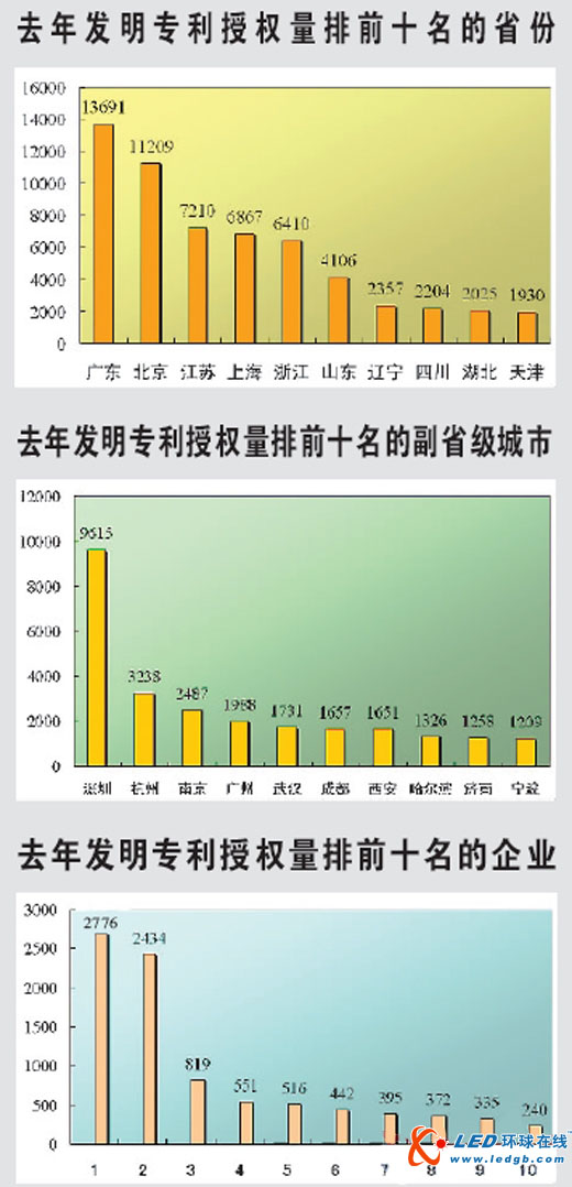 专利授权方面,广东省2010年LED授权专利数量为1270件,居全国第一。