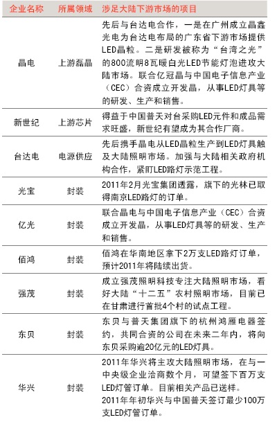 中国“十二五”重达6000亿元的LED照明大蛋糕,各方垂涎,以致台湾相关媒体发出“不知十二五,恐遭市场淘汰”的声音。这种敏锐的市场嗅觉,是台企的一种集体市场意识。君不见,LED上游磊晶龙头晶电已经在大陆市场上开疆扩土,积极寻找下游出海口,将触角从上游延伸到下游终端。电源供应器龙头台达电,也借助发力照明市场之势,布局大陆下游市场。亿光、光宝、佰鸿、华兴等封装企业,亦纷纷拿下大陆LED路灯大单。
