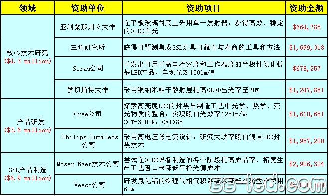【高工LED专稿】 【高工LED讯】日前,美国能源部(DOE)宣布了8项LED/OLED研发资助项目,涵盖核心技术、产品及设备三个方面,资助金额总计达1.5亿美元。其中Cree、Philips Lumileds、Veeco均有研发项目获得了DOE的资金支持。(详见下表)