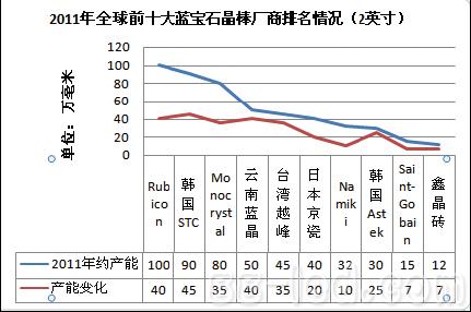 除此十大蓝宝石晶棒厂商之外,韩国三星LED也和住友化学在2011年3月合资成立蓝宝石公司,总投资金额2100亿韩元,设计产能2寸500万片(或4寸120万片),与日本京瓷的产能相当。