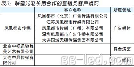 主要直销客户分为两大类:一是以凤凰都市传媒、大连国域无疆传媒集团有限公司、北京中视迅驰舞美艺术有限公司等为主的广告媒体类客户和部分LED演出设备租赁公司。由于这些客户既具有较强的偿债能力,同时又具有长期的产品需求,并且已经与公司多次进行过合作,所以将其作为核心客户;二是在政企宣传、舞台演艺和体育场馆等应用领域持续开发的客户,如政府机关、事业单位、各地方电视台、大中型上市公司、银行、央企、三甲医院等。这部分客户分属不同行业,通常不具备持续购买的需求,因此区域分布每年有所不同,总体上以华东、华北、华南等区域为主。