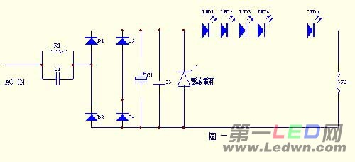 图一 为一个实际的采用电容降压的led驱动电路﹕请注意﹐大部分应用电路中没有连接压敏电阻或瞬变电压抑制晶体管﹐建议连接上﹐因压敏电阻或瞬变电压抑制晶体管能在电压突变瞬间( 如雷电﹑大用电设备起动等 )有效地将突变电流泄放﹐从而保护二级关和其它晶体管﹐它们的响应时间一般在微毫秒级 。