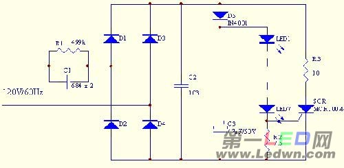 在图 二 电路中﹐可控硅SCR及R3组成保护电路﹐当流过LED的电流大于设定值时﹐SCR导通一定的角度﹐从而对电路电流进行分流﹐使LED工作于恒流状态﹐从而避免LED因瞬间高压而损坏。