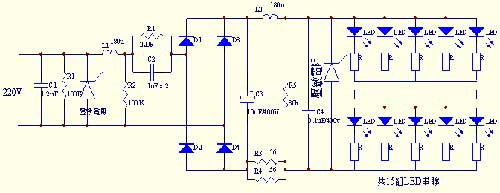 在图三电路中﹐C1﹑R1﹑压敏电阻﹑L1﹑R2组成电源初级滤波电路﹐能将输入瞬间高压滤除﹐C2﹑R2组成降压电路﹐C3﹑C4﹑L2﹑及压敏电阻组成整流后的滤波电路。此电路采用双重滤波电路﹐能有效地保护LED不被瞬间高压击穿损坏。