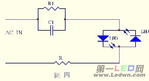 图四 是一个最简单的电容降压应用电路﹐电路中利用两只反并联的LED对降压后的交流电压进行整流﹐可以广泛应用于夜光灯﹑按钮指示灯﹐要求不高的位置指示灯等场合