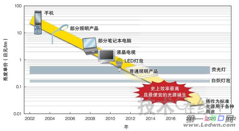 白色LED的单价今后一段时间内还会继续降低。很多LED厂商认为,LED的价格将以年均30%或更高的速度下降。如果一直保持这一速度,那么到2015年将低于0.2日元/lm,降到与白炽灯泡相同的水平注1)。