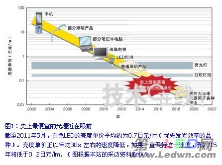 由于降低照明器具中的光源成本下降,目前已经是“LED照明价格不再高”(远藤照明)的状况。导入LED照明的门槛——初期投资的大幅降低也是LED照明因东日本大地震进一步受到关注的理由。