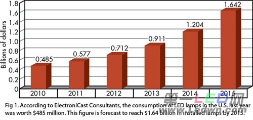Electronicast Consultants最近公布的市场研究报告认为,去年美国消费的led灯泡价值4.85亿美元。该公司预测,以2015年该数字将达到16.4亿美元(图1)。