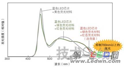 改进的重点是,“减少可视范围以外的发光”(飞利浦流明日本)(图10)。一般情况下,白色LED为提高Ra和红色显色指数(R9)会添加红色荧光材料,红色荧光材料的发光光谱可到达700nm以上的近红外领域。由于肉眼看不见可视范围以外的光,因此这部分的能源全部浪费了。所以该公司采用了可减少这部分光的红色荧光材料。
