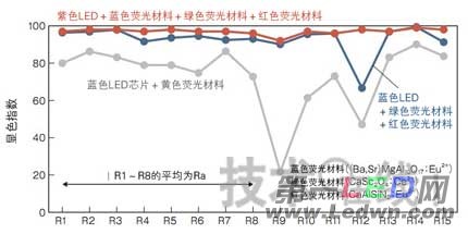 显色指数通过改进荧光材料来提高。不过,提高显色指数也会出现发光效率降低的问题。例如,假设Ra为70的普通白色LED的发光效率为100%,则Ra80时会降低10%,Ra90时会降低20%。“以前在Ra为90以上时,发光效率会降低30%”(日亚化学工业)。因此与以前相比,现在已经改善了很多,不过今后还有很大的改进余地。