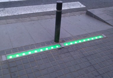 在交通不太繁忙的时段,绿灯变为红灯后依然有不少行人横穿马路,而不幸时有发生。为减少此类交通事故,西班牙照明系统制造商 DSTA 研发出了一种人行道变色光带,就铺设在行人脚下,与交通信号灯同步告知行人是否可以安全通行。该警示灯嵌入人行道内,与交通信号灯切换系统保持同步:交通灯变为红色时,“光带”同时切换为红色,警示行人应停止通行;交通灯变回绿色时,“光带”也立即变为绿色。双色“光带”旨在提高行人警惕性,提醒行人红灯时不要穿越马路,即使当时路上没有过往车辆也要停下脚步。为确保指示灯信号灵敏可靠,DSTA 选用了欧司朗光电半导体的红光和绿光 Golden DRAGON LED 作为光源。这些 LED 的响应时间仅为纳秒级,因此在信号切换时不存在任何延迟,从而提高了行人的安全性。