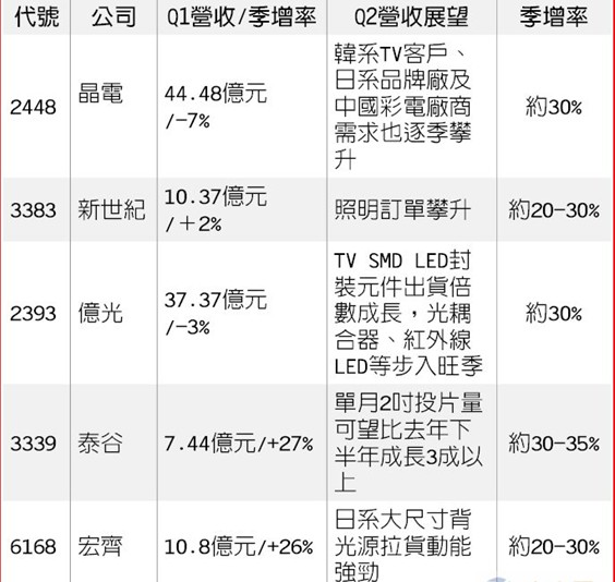 在上游LED磊晶、晶粒方面,预期包括晶电(2448)、璨圆(3061)、泰谷(3339)、新世纪(3383)等大厂均可望受惠于日韩系电视品牌新机种供应链,顺利步入LED传统旺季,产能利用率可望从年初的60-70%,逐渐拉升至满载。