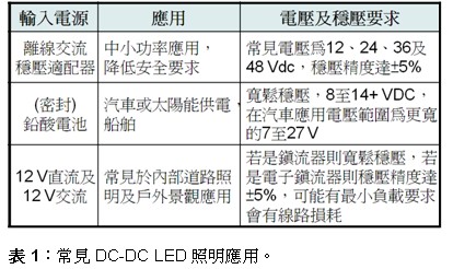典型LED DC-DC降压应用有如线槽灯、书架灯及展示柜灯等中使用的高亮度模组化灯条,一般每条(11.5 x 1英寸) 4颗LED,根据颜色的不同,光效为23至47 lm/W,电压为23至25 V 。