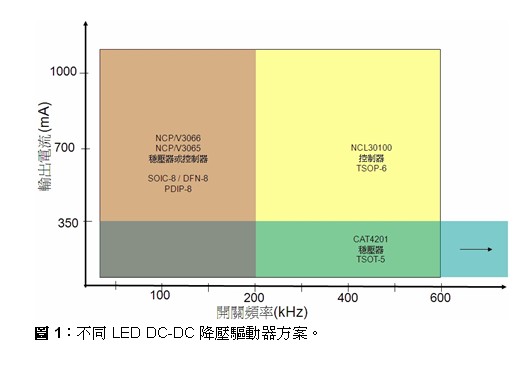 根据频率及电流的不同,此类应用中可以使用安森美半导体提供不同的LED DC-DC降压驱动器方案,包括NCL30100控制器、CAT4201稳压器,以及能够配置为降压稳压器的NCP3065/NCV3065、NCP3066/NCV3066稳压器及控制器等(见图1)。这些方案各有其特点。