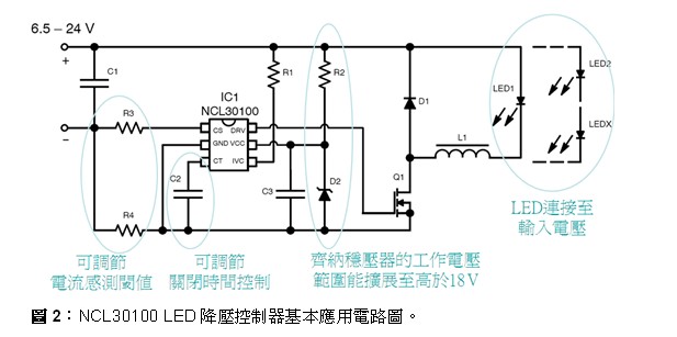 例如,NCL30100作为控制器,本身并未整合FET,但它支援使用高性价比的N通道MOSFET作为外部元件,能够调节电流,并以100%的占空比工作。但此元件的电源电压(VCC)能达18 V,需要外部元件以支援较高电压,且需要用于确定数量的LED设计。NCL30100适合MR16灯泡、12 V景观照明、太阳能供电LED照明、线性照明及看板文字电路和标志背光等应用。