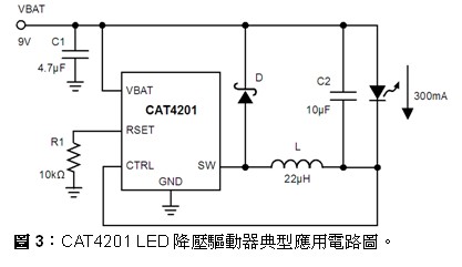 CAT4201则是整合了MOSFET开关的完整电源转换器,采用小型TSOT5封装,最高电压36 Vdc(可承受40 V暂态电压),能驱动总电压达32 V的7颗串行LED,电源能效高达94%,提供限流及热保护。但此元件在大多数应用中要求输出电容,且LED输出电流限流为最大350 mA。CAT4201适用于12 V及24 V照明系统、汽车及飞机照明和通用照明等应用。