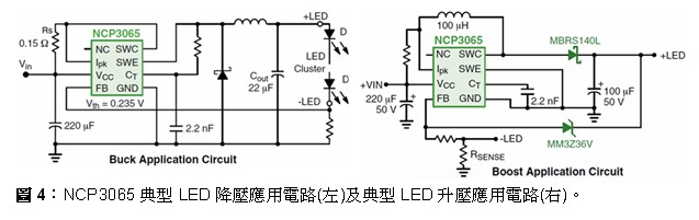 如上所述,NCP3065/6、NCV3065/6能够配置为不同结构,图4右显示的是即是配置为升压结构的应用电路图。