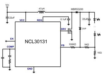 图5:NCL30131高能效升压LED驱动器典型电路图
