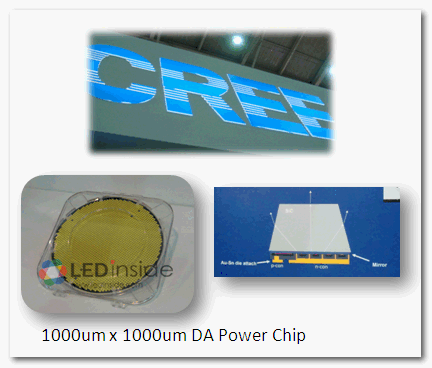 Cree 展示了Dirrect Attach (DA) power chip,使用矽基板并搭配共晶技术并将pn 接面 (pn junction)至于芯片下方,简化制程,热阻低,不仅导热系数大幅提升,驱动电流,lumens /area和lumens /$也因此提高,无须打线,并已经过表面粗化过程,因此只要再经过热处理回流过程(reflow)机台就可,主要应用在照明产品,规格大小从350umx470um,至1400umx1400um。