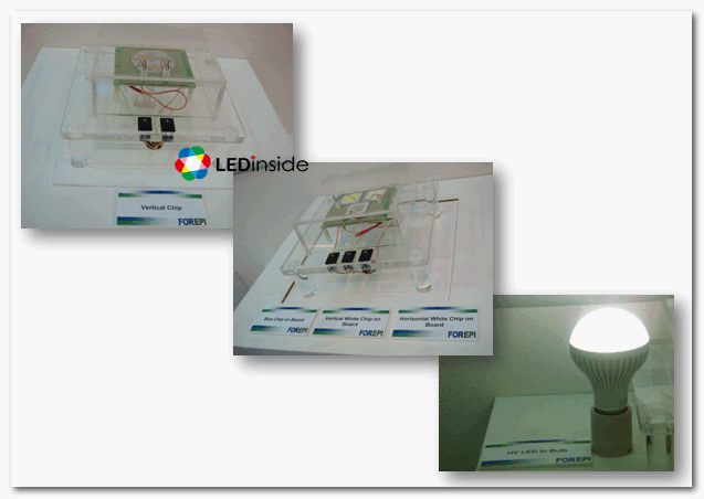 璨圆除了会场中展示220V下的HV LED在110V的AC LED,适用在体积小的灯具上如烛形灯外,也推出以矽基板的垂直式芯片(Vertical LED),不仅散热效果提高,导热系数高达130w/mk、驱动电流也随之上升,发光效率也随之提高;加上指向性好,聚光性强,多应用于微型投影机。白光LED(White Light LED),萤光粉直接涂布在LED芯片上,加上因为是COB产品,已经分好Bin,直接打线,便于封装业者封装,光形均匀,更可以节省红色萤光粉的使用。