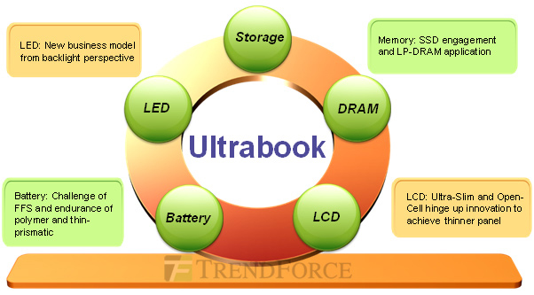 整体而言,Ultrabook必然侵蚀传统笔记型电脑的市场,但却也带动另一波产业技术的提升与需求,由集邦科技旗下各单位针对各零组件的研究分析来看,Ultrabook对各关键零组件的发展,多数还是呈现正面成长的趋势。但也由于以上关键零组初期成本高于传统笔记型电脑,因为各厂很难比照苹果 MacBook Air的规格与价格来与之竞争。