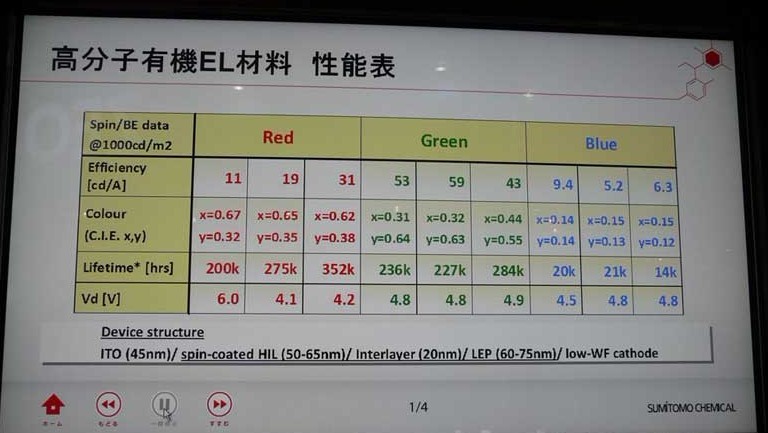 新發光材料與住友化學2010年開發的產品相比,提高了色度、延長了壽命。紅色發光材料方面,開發出了發光效率為31cd/A,色度為x=0.62、y=0.38,壽命(亮度由1000cd/m2減半的時間)為35萬2000小時,電壓為4.2V的品種等。2010年擁有相同色度的材料壽命還不到20萬小時。