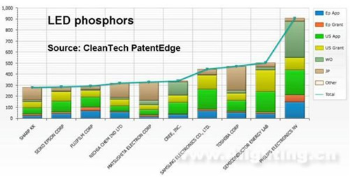 通过图表可看出,LED荧光粉专利的顶级公司是飞利浦、半导体能源研究所和东芝,按地区划分,美国和日本的LED专利数最多,在过去五年中,欧洲专利已逐步增加,但相比美国仍然在市场上的份额很小。