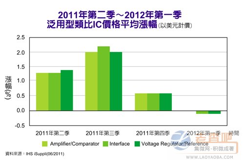 日本311大地震造成的供应链中断问题,持续在泛用型类比元件市场发酵。IHS iSuppli指出,2011年第三季泛用型类比IC如放大器(Amplifier)、比较器(Comparator)、介面元件和电压调节器 (Voltage Regulator)等价格涨幅将达2%。不过,第四季的涨幅可望下降至0.6%,并开始逐渐恢复正常的季节性波动。