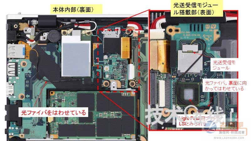 图1:就笔记本电脑的内部结构来看,连接器与光收发模块的距离长,由此可见,机壳内铺设了光纤。(点击放大)