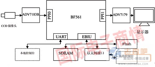 双内核汇聚式处理器ADSP BF561是ADI公司Blackfin产品家族中的一个具有高性能成员,它包括两个独立的ADI处理器核,每个处理器核包含一个双乘法累加器信号处理机,一个类RISC指令集,每个内核均采用完全的SIMD架构,包含用于视频加速处理和图像处理的指令。汇聚式处理器的特点是减少或避免了采用单独的数字信号和控制处理器的需求,从而减少了物料成本,同时极大地简化了软硬件开发任务。Blackfin处理器同时提供了全面的电源管理方案,独特的低功耗和低电压设计(Blackfin可以由低于2V的外部电压供电),减少了整体的功耗,这对于全天候运行的视频监控来说具有非常重要的意义。