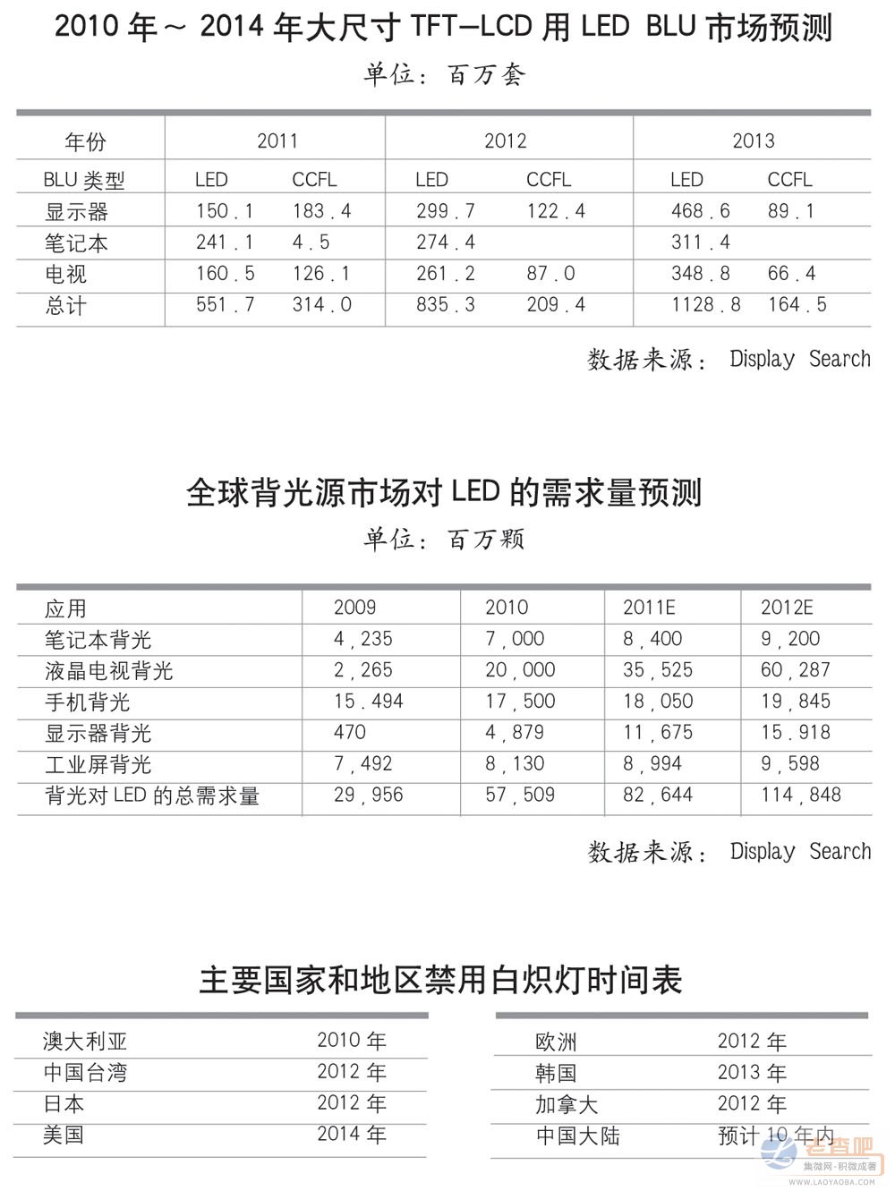 清华大学液晶技术工程技术中心教授张百哲说,今后5年内,大尺寸TFT-LCD用LED背光将是一个高速增长期,年平均增长率将超过20%,到2014年平均占有率将达96%。而全球70%的TFT-LCD模组在中国生产,TFT-LCD模组成本费用中70%以上又是原材料,液晶背光市场对原材料需求持续增长的脉络清晰可见。他还分析说,在中小尺寸市场(特别是手机)由于受到AMOLED挤压,LED背光市场开始下滑,而且这种挤压将在5年后加剧。好在2014年后LED照明市场会进一步上量,可以弥补和衔接背光市场的需求缺口。