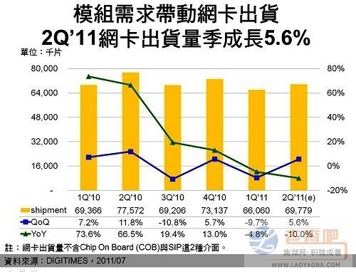而无线路由器部分,零售端出货量持续因淡季需求偏低而未见起色,但靠电信标案市场稳定出货带动,出货量也较上季小幅成长。从整体出货量来看, 2011年第二季台厂整体出货量达8,576万套,较2011年第一季成长4.9%,但较2010年同期下滑10.9%,因该时段有缺工缺料造成的订单递延、拉高比较基期。