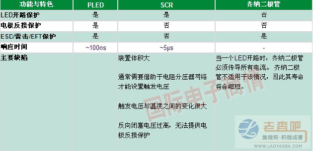目前市场也有人考虑利用SCR和齐纳二极管进行LED保护,但这三种保护元件其实有很多不同的属性,不是通用互换产品。请看以下关于LED保护元件与常见的SCR以及齐纳二极管性能的比较:1)LED保护元件能够提供LED开路保护;SCR也能提供该保护,但齐纳二极管不提供,因为灯串电流会导致齐纳二极管过载并缩短其使用寿命。 2)LED保护元件提供电极反接保护,而SCR和齐纳二极管则不提供。 3)LED保护元件和齐纳二极管均提供ESD/雷击保护,而SCR则不提供。(请见图1)。