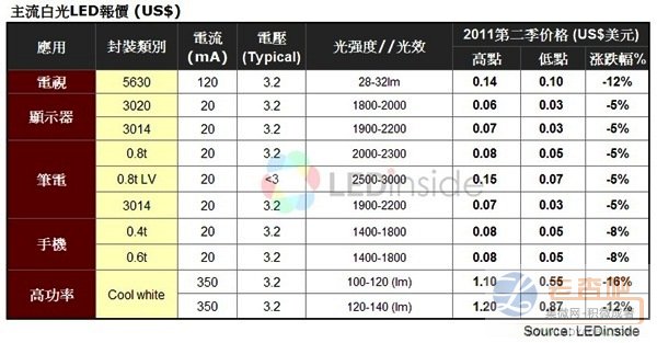 手机部分,手机市场出现疲软状况,整体市场销售下滑,导致LED需求量遽降,价格也出现近期较为低靡的现象,降幅约为8~10%。至于在照明应用的大功率LED,因库存调整影响,报价剧烈下滑,平均跌幅达10~15%。