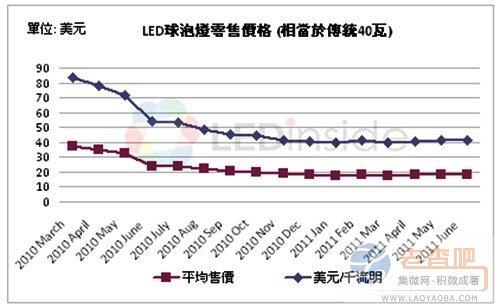LED发光效率的提升实现了 LED照明的早日来到,LEDinside针对全球取代40W传统灯泡的LED灯泡,亮度在450-485流明商品的零售价做了调查。调查显示,这类商品从去年3月到2011年6月跌幅高达55%。单颗平均零售价也来到24美元,每千流明约52美元。LED灯泡价格的持续下滑,可望刺激扩大应用需求。