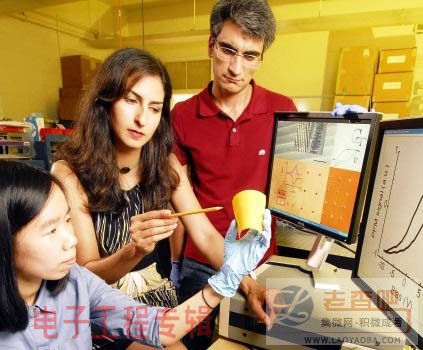 图左是乔治亚理工学院的博士后研究员Suenne Kim,手上拿着乘载铁电纳米结构的柔性聚合物基板,中间是该团队领导人Nazanin Bassiri-Gharb,以及右方的研究生助理Yaser Bastani(图片由乔治亚理工学院Gary Meek提供)