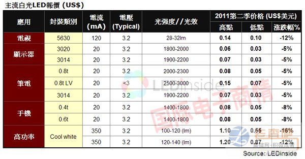 NB、Monitor、Mobile等应用的LED背光产品规格趋于成熟,仅管第二季NB市场需求疲弱,但是由于部分产品如3014等规格仍可应用在照明领域,因此2011年第二季下滑幅度有限。
